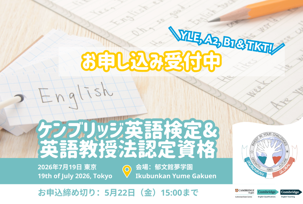 Cambridge English Qualifications are among the world’s most widely recognised English exams, developed by Cambridge University Press & Assessment, a department of the University of Cambridge, UK. Aligned with the CEFR, they assess all four language skills from Pre-A1 Starters through to C2 Proficiency, providing clear milestones that support long-term language learning and sustained motivation. In Japan, a growing number of universities now recognise Cambridge English Qualifications as valid proof of English proficiency for admission, with many institutions accepting results at B1 level and above. These qualifications are also highly valued for study abroad and employment overseas, and allow for smooth progression to IELTS. In Tokyo, exams are offered four times a year — in March, July, September, and December — at venues across the region.